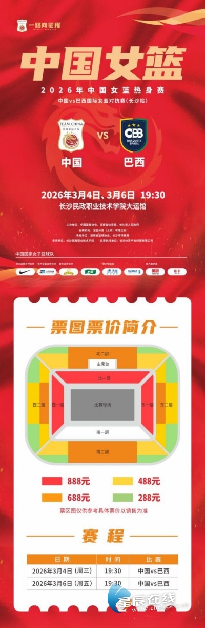 当中国女篮的青春活力遇上巴西女篮的刚猛强悍,当主场的热情与篮球的热爱碰撞,这场赛事注定精彩纷呈!3月4日和6日,相约星城,让我们现场见证“无畏金兰”的拼搏风采,共同为中国女篮加油助威。赛事门票正在大麦网、看个比赛、秀动、抖音等官方指定票务平台火热销售中。