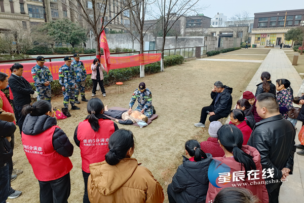 (宁乡市亮剑应急救援队走进小区,开展防火、应急逃生技能科普。长沙市退役军人服务中心 供图)