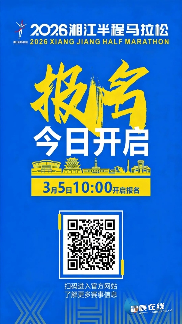 星辰在线3月5日讯(星辰全媒体记者 贺亚玲) 3月5日10:00,2026湘江半程马拉松报名通道正式开启,赛事将于4月26日7:00在长沙鸣枪开跑。本届赛事设男子、女子半程马拉松(21.0975 公里)项目,总参赛规模15000人。