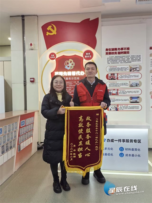 后来张女士专程送来一面锦旗,写着“政务服务暖人心,高效便民显担当”,感谢赵宁的周到服务。赵宁介绍,他所在的“芙蓉先锋帮代办”团队至今已收到32面来自群众的锦旗,每一面背后都是团队践行初心、为民解忧的缩影。