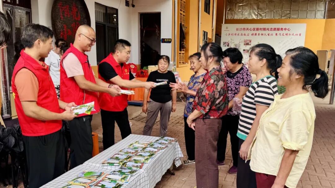 【汤俊杰(左三)组织志愿者向群众宣传法律法规和惠民政策】