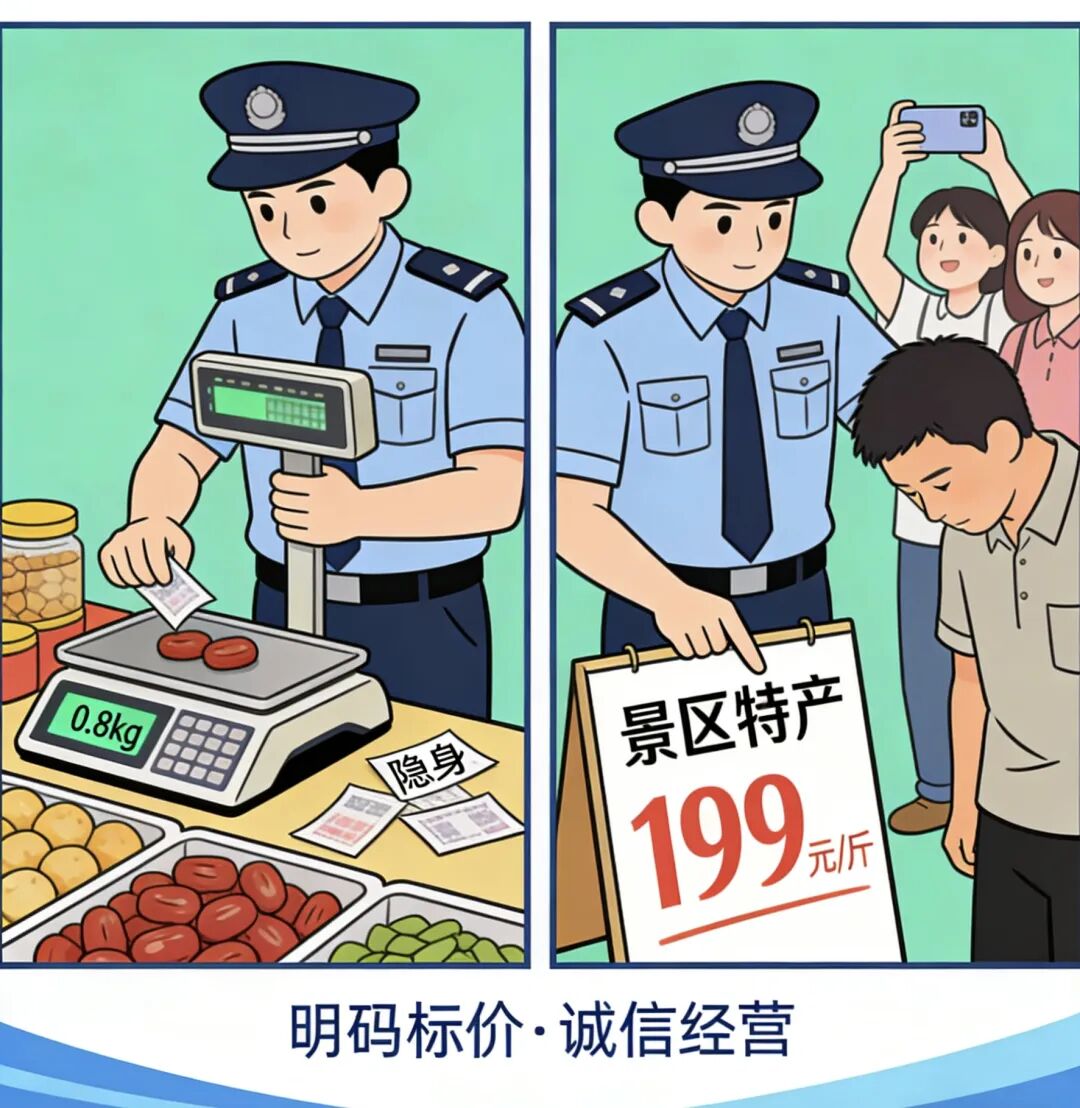 依据《消费者权益保护法》《价格法》《计量法》,不明码标价、价格欺诈、缺斤短两、强制消费——发现一起、查处一起,依法没收违法所得,情节严重的责令停业整顿、列入景区黑名单。