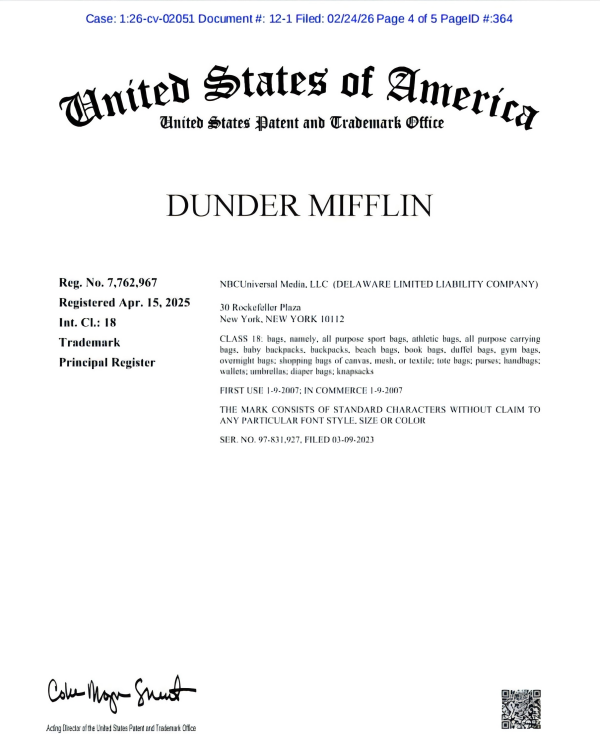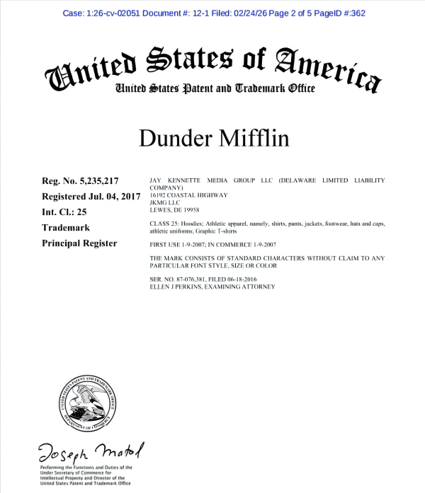 2.原告介绍:NBCUniversal Media,LLC是全球知名媒体与娱乐公司,旗下拥有多家有线及广播电视网,业务覆盖新闻、娱乐、体育、生活方式等领域。其出品的经典情景喜剧《The Office》中,虚构的办公用品批发公司DUNDER MIFFLIN凭借剧集全球热播,成为兼具高辨识度与商业价值的IP品牌。