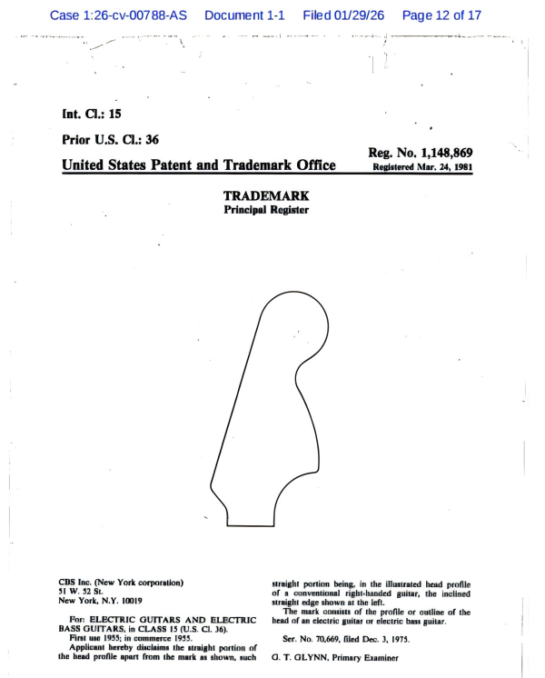2.原告介绍:芬达乐器公司(FENDER MUSICAL INSTRUMENTS CORPORATION)1946年创立于美国加利福尼亚州,是全球领先的乐器制造企业,旗下Stratocaster、Telecaster等经典产品享誉全球。公司高度重视知识产权保护,拥有多项美国联邦注册商标与全球专利,运营体系完善,在全球开展品牌维护、市场推广与渠道管理,是业内兼具高知名度与美誉度的跨国企业。