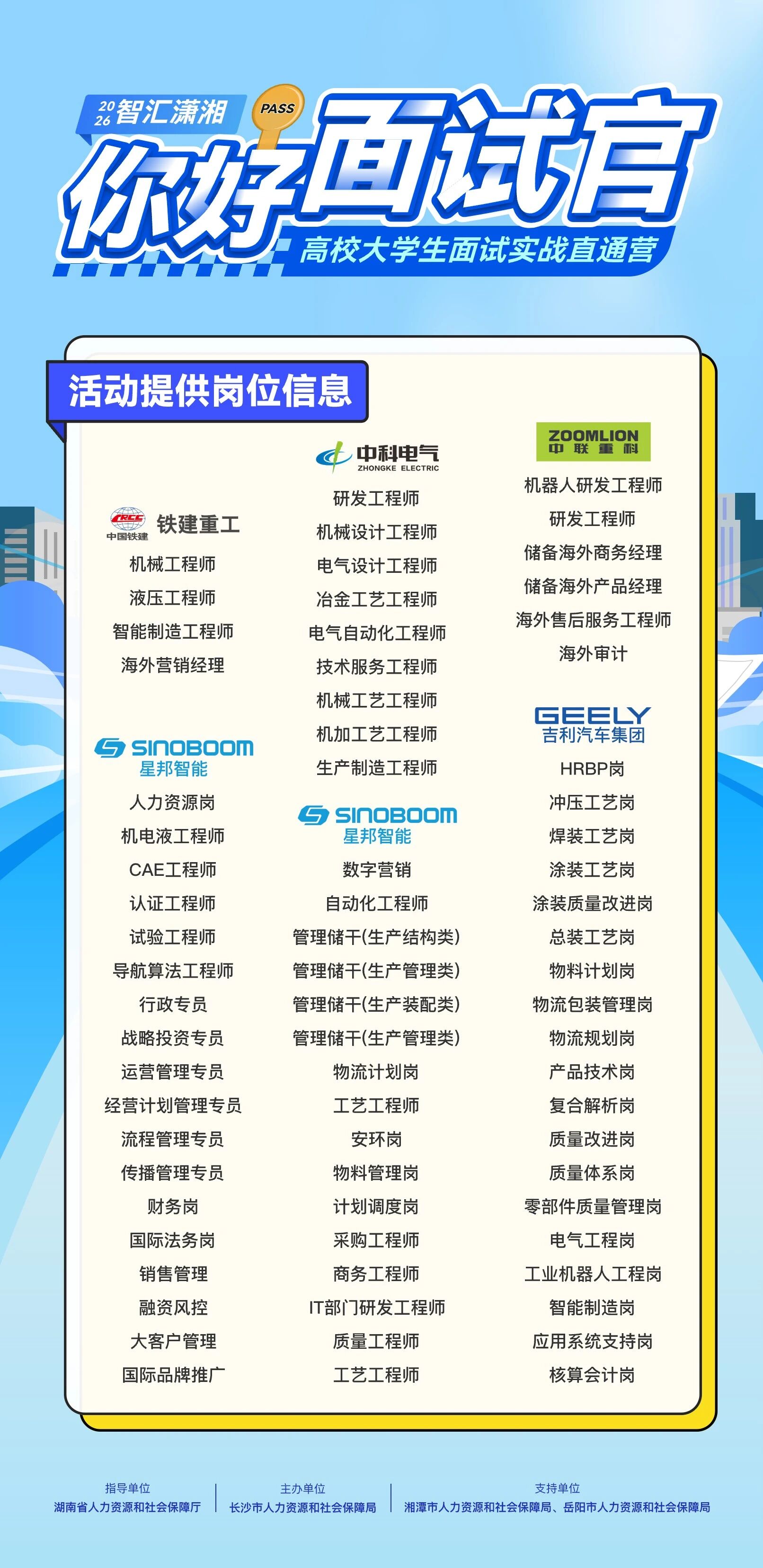 无论你是专科大三、本科大四,还是硕士、博士研究生,只要你2026年毕业,这就是你跨越海投海选,直通湖南名企的绝佳机会。届时,中联重科、铁建重工、星邦智能、吉利汽车、中科电气五大名企HR现场摇人,招聘岗位覆盖研发、技术、营销全链条,表现优异者现场解锁“offer直通车”,直接锁定终面资格甚至录用意向。