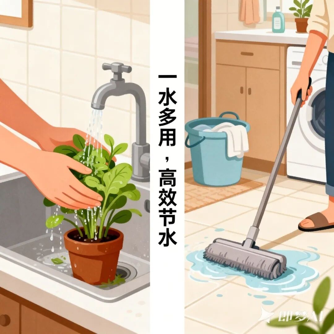我们可以这样做:洗菜、淘米的水收集起来浇灌绿植,实现绿植养护与节水双赢;洗衣、洗脸的水留存用于拖地、冲厕,最大化提高生活用水利用率。