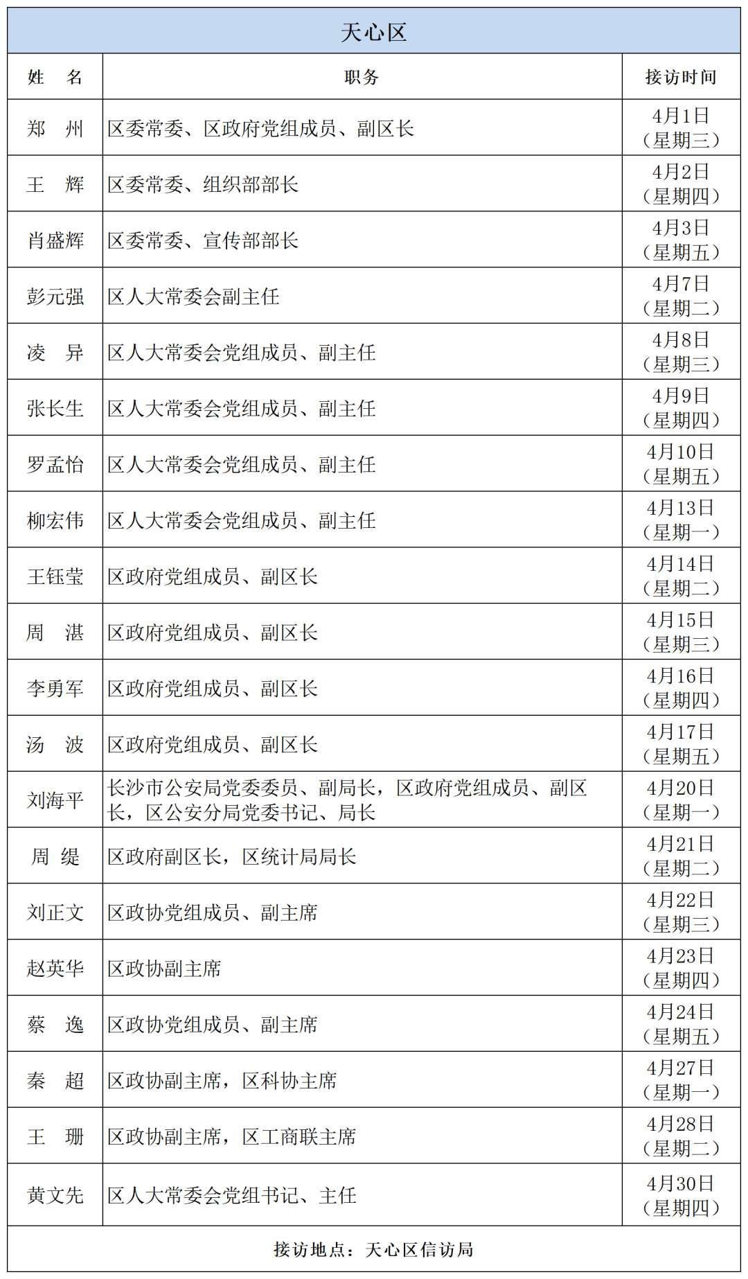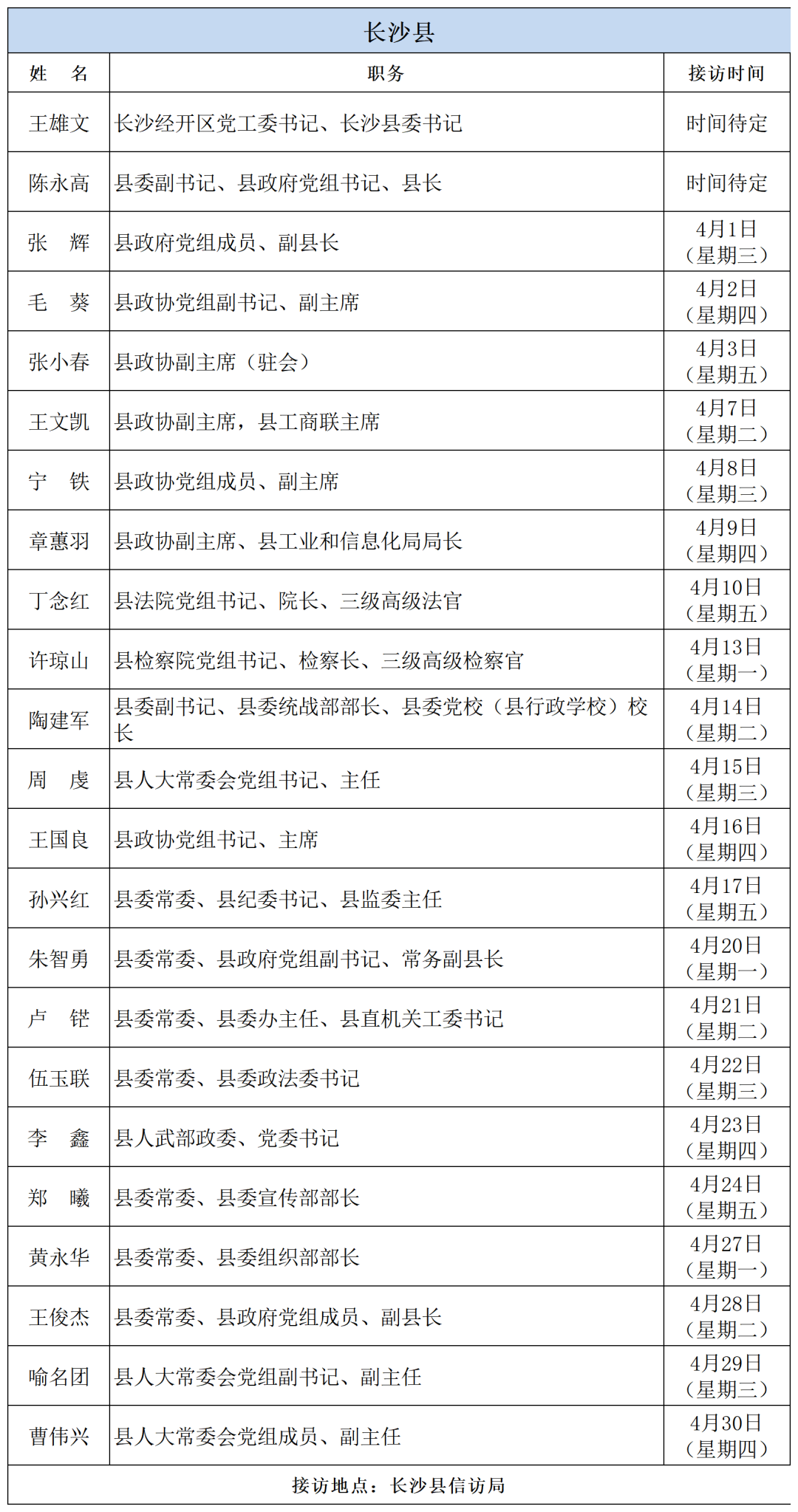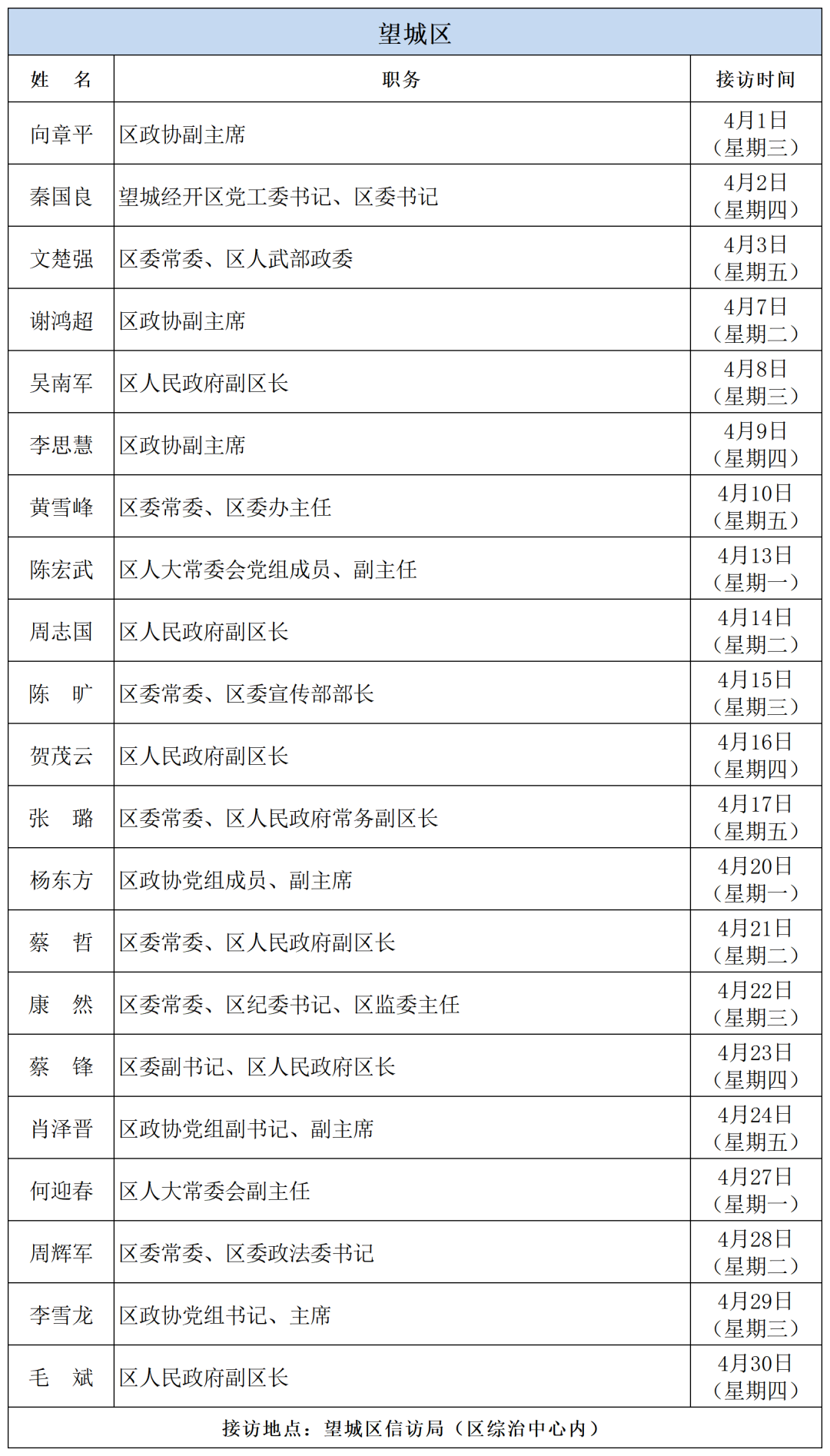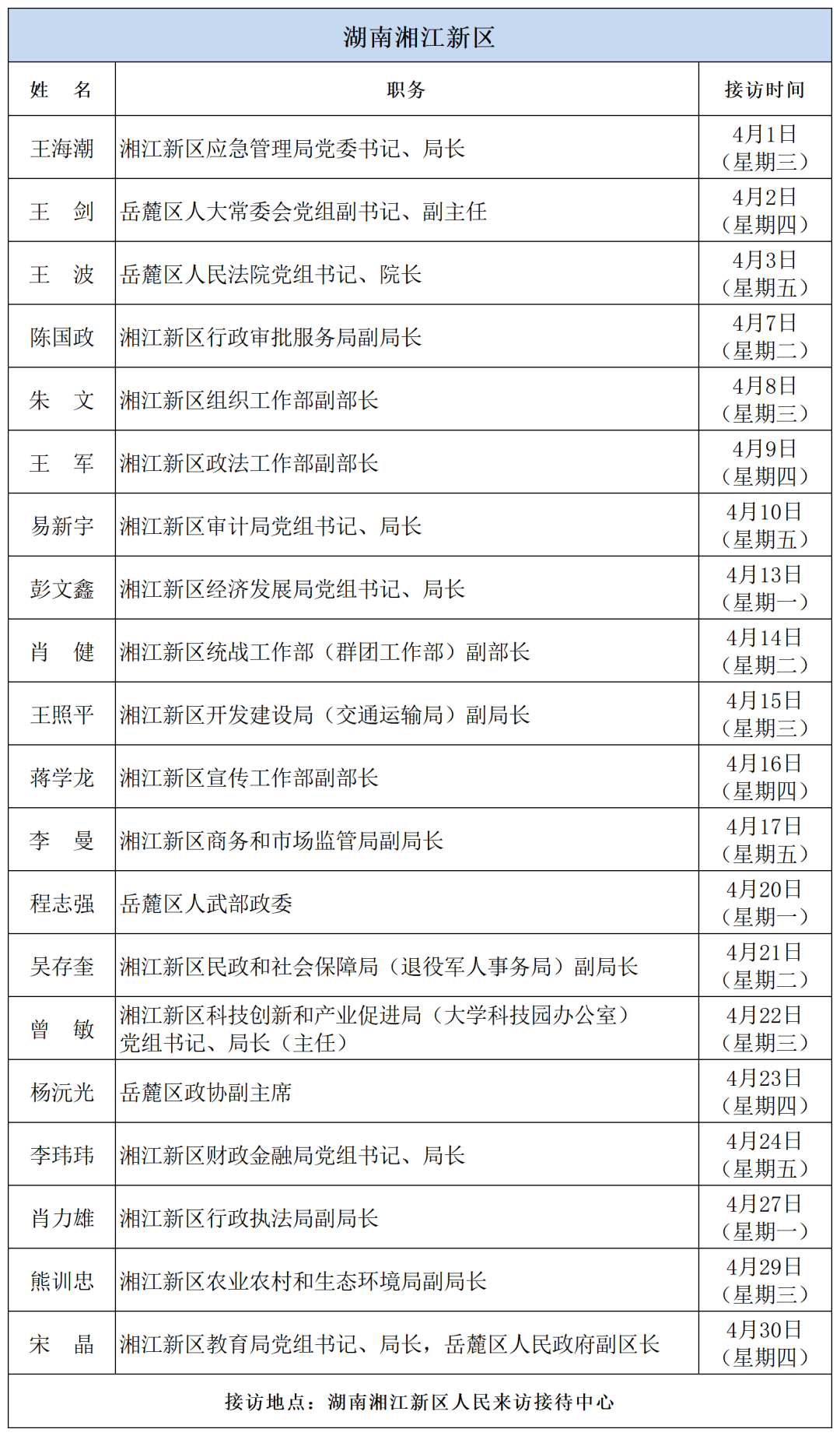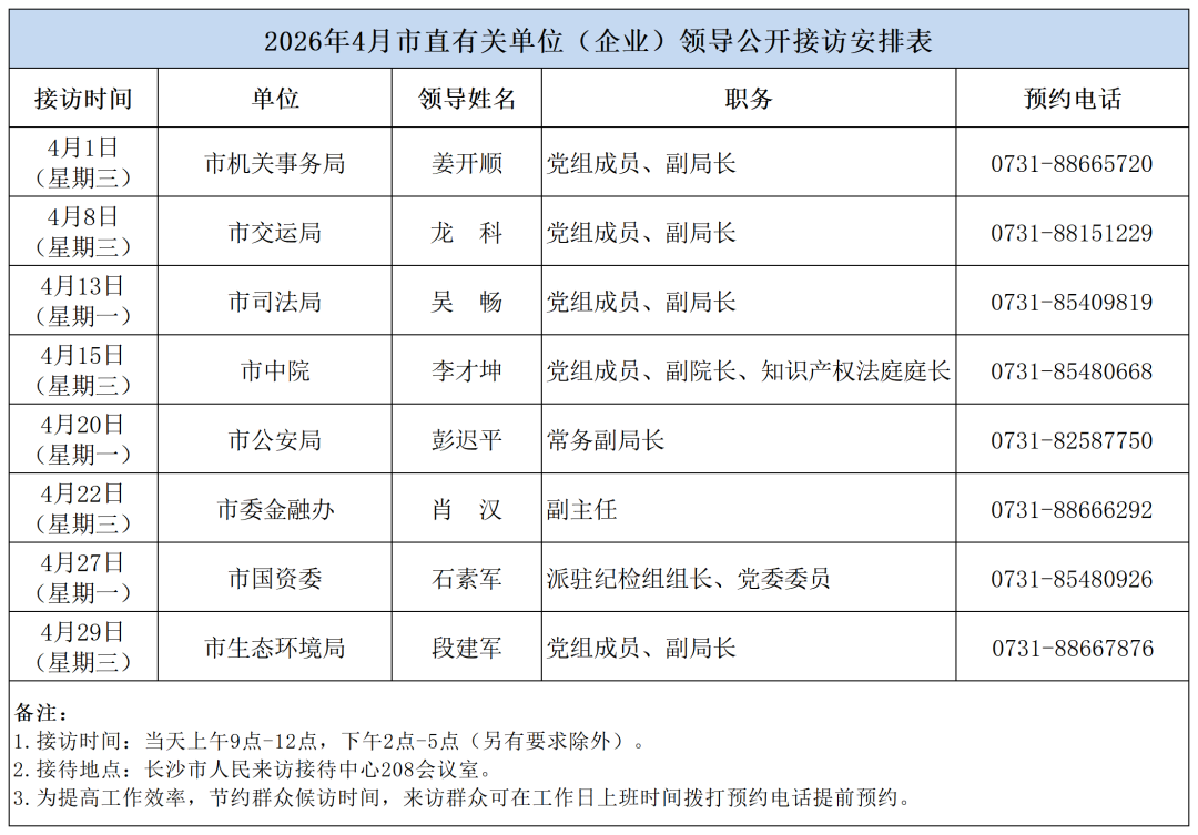 为密切联系群众,畅通信访渠道,依法及时就地解决群众合理合法诉求,现将2026年4月湖南湘江新区、各区县(市)及相关市直单位(企业)领导接访安排予以公告,群众可根据公告的接访安排到指定地点反映诉求。