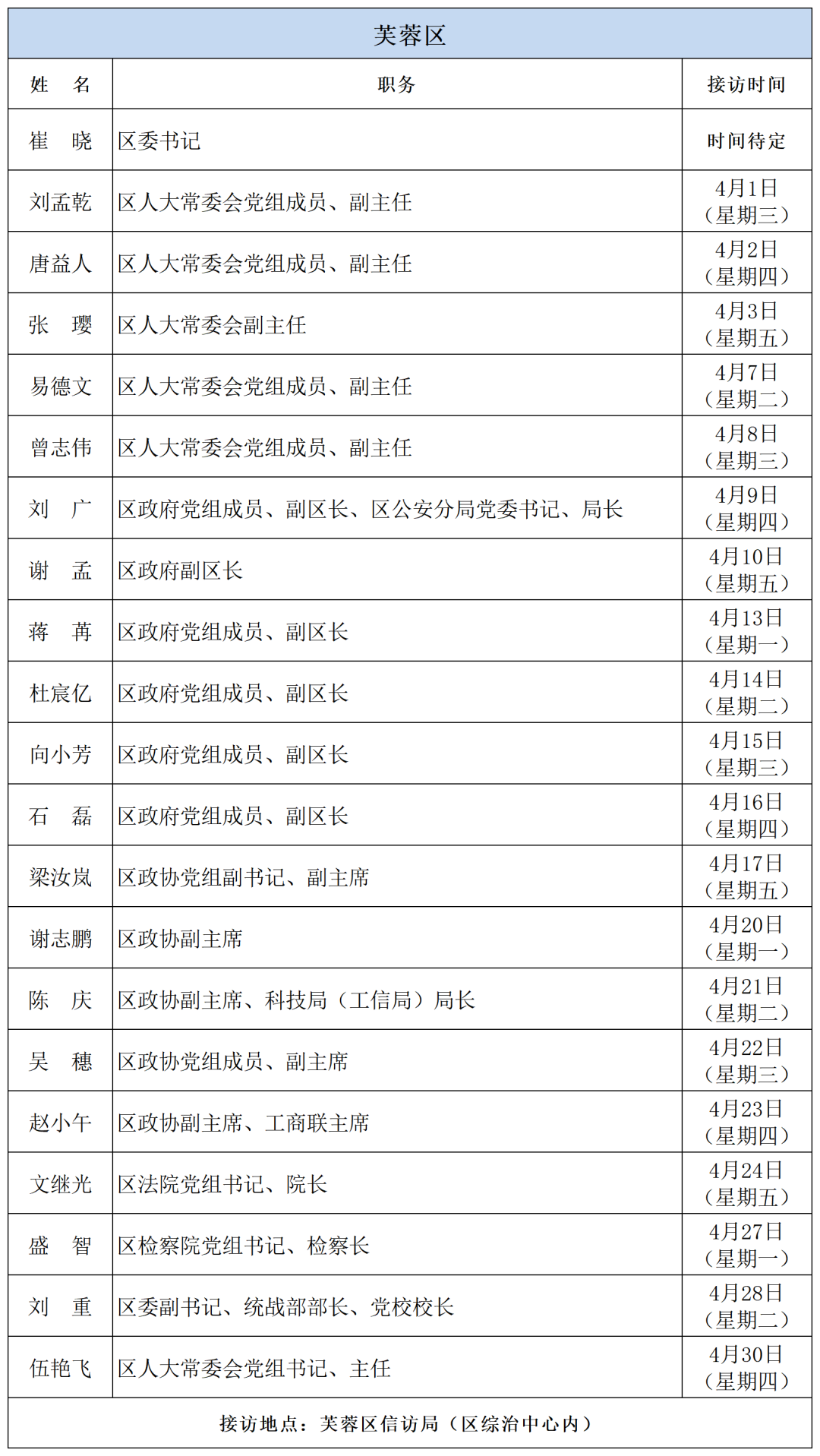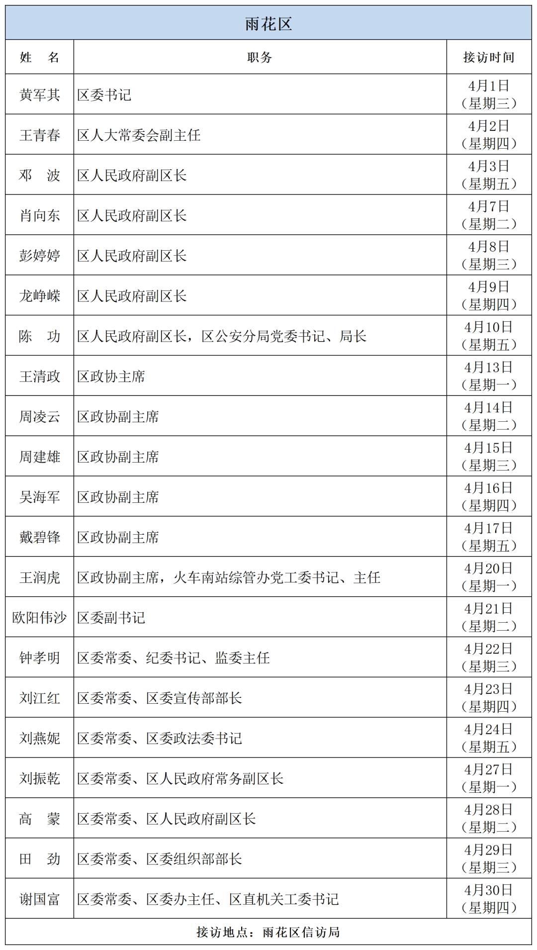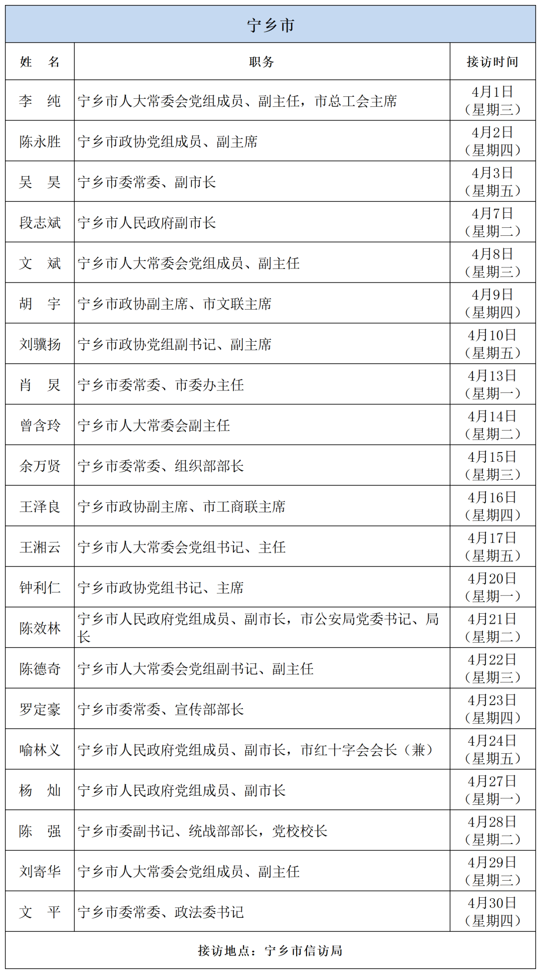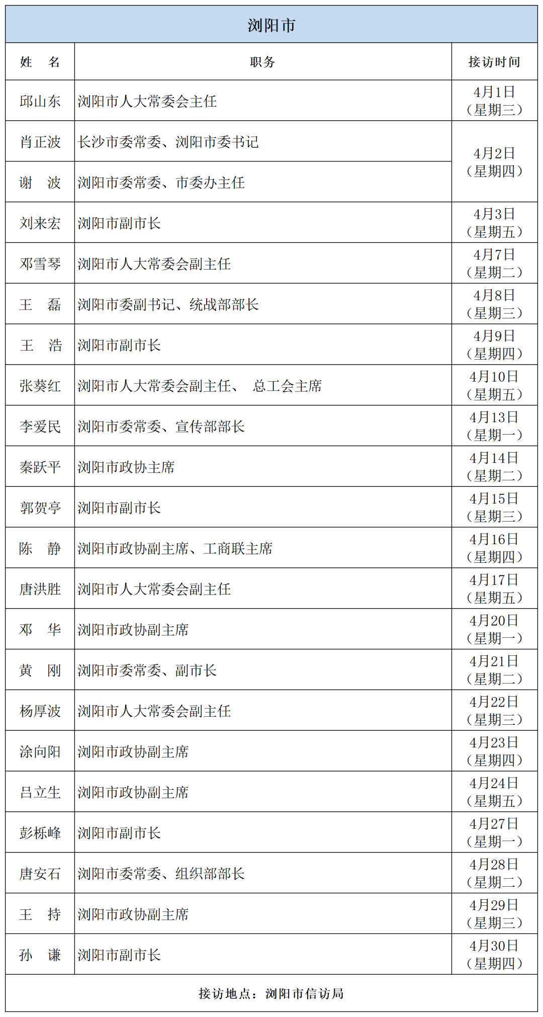 为密切联系群众,畅通信访渠道,依法及时就地解决群众合理合法诉求,现将2026年4月湖南湘江新区、各区县(市)及相关市直单位(企业)领导接访安排予以公告,群众可根据公告的接访安排到指定地点反映诉求。