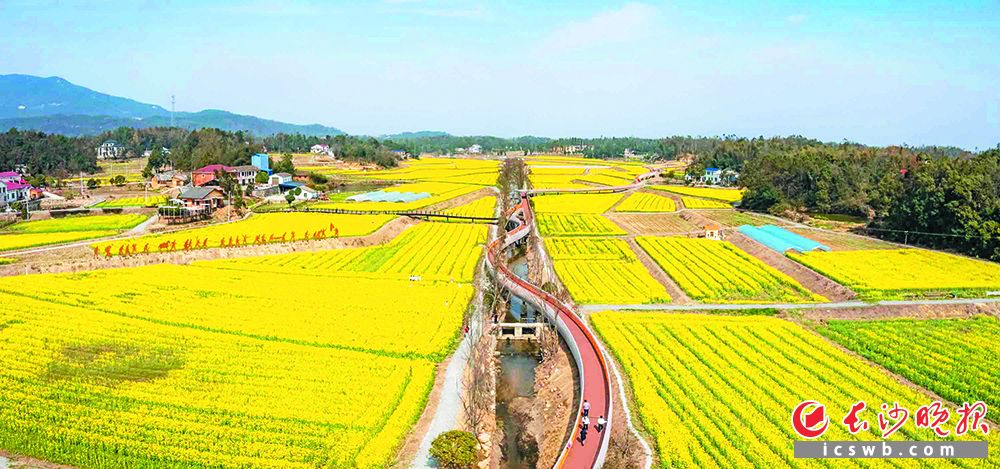 在陈树湘故里,旅游步道蜿蜒穿过千亩油菜花海,红色文化与乡村美景交相辉映。福临镇供图
