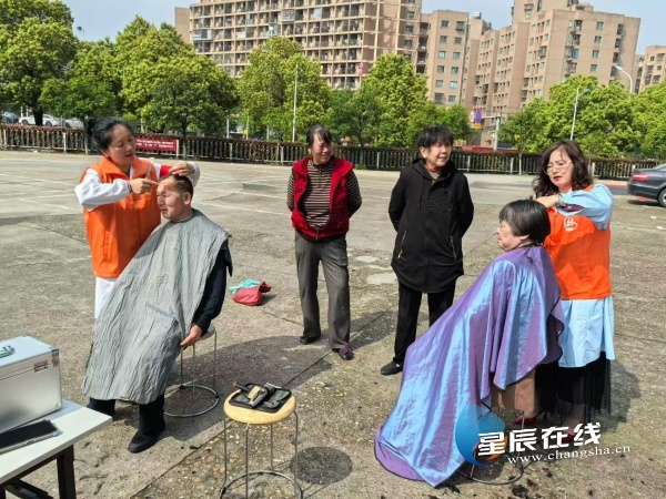 (工作人员与志愿者们为社区特困人员、残疾人员提供爱心义剪服务。)