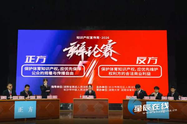 星辰在线4月26日讯(星辰全媒体记者 李政伦)4月24日上午10时,一场兼具专业深度与跨界特色的 “世界知识产权日” 主题辩论赛,在湖南体育职业学院火热开赛。本次活动由长沙市雨花区人民法院主办,湖南大学、湖南体育职业学院共同承办,并得到湖南省高级人民法院、长沙市中级人民法院的精心指导。