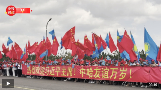 当地时间6月16日中午,习近平主席乘车从机场赴下榻饭店途中,中资企业和留学生代表聚集在道路两旁,手持“热烈欢迎习近平主席!”“中哈友谊万岁!”等红色横幅。哈方直升机沿途护卫,热烈欢迎习近平主席到访。
