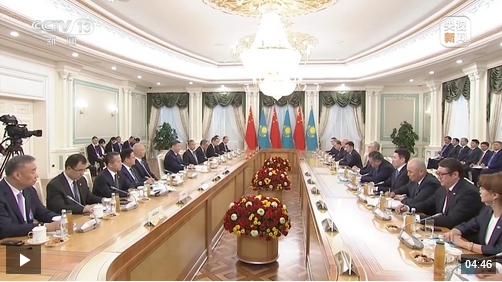 当地时间16日下午,习近平主席抵达阿斯塔纳后的第一项日程,就是在阿斯塔纳总统府同托卡耶夫总统会谈。