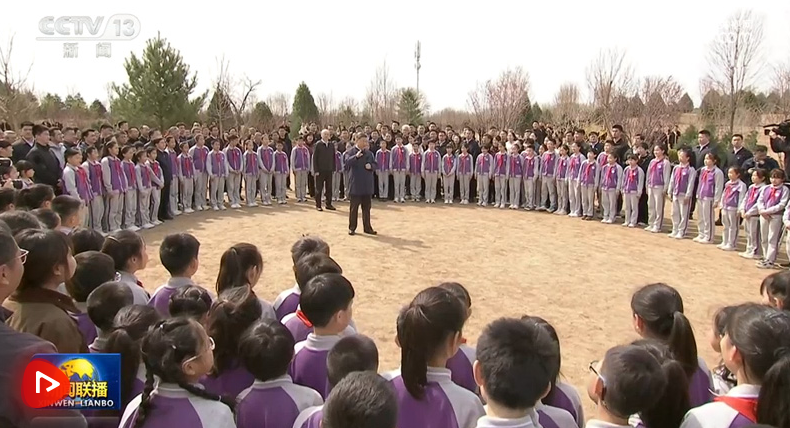 3月30日,党和国家领导人习近平、李强、赵乐际、王沪宁、蔡奇、丁薛祥、李希等来到北京市昌平区百善镇参加首都义务植树活动。这是习近平同在场的干部群众、少先队员亲切交谈。