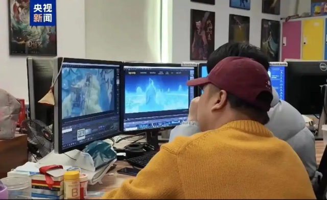 △《哪吒2》壮观的特效背后,是全国138家动画公司的合力托举。图为创作团队正在确认画面效果。