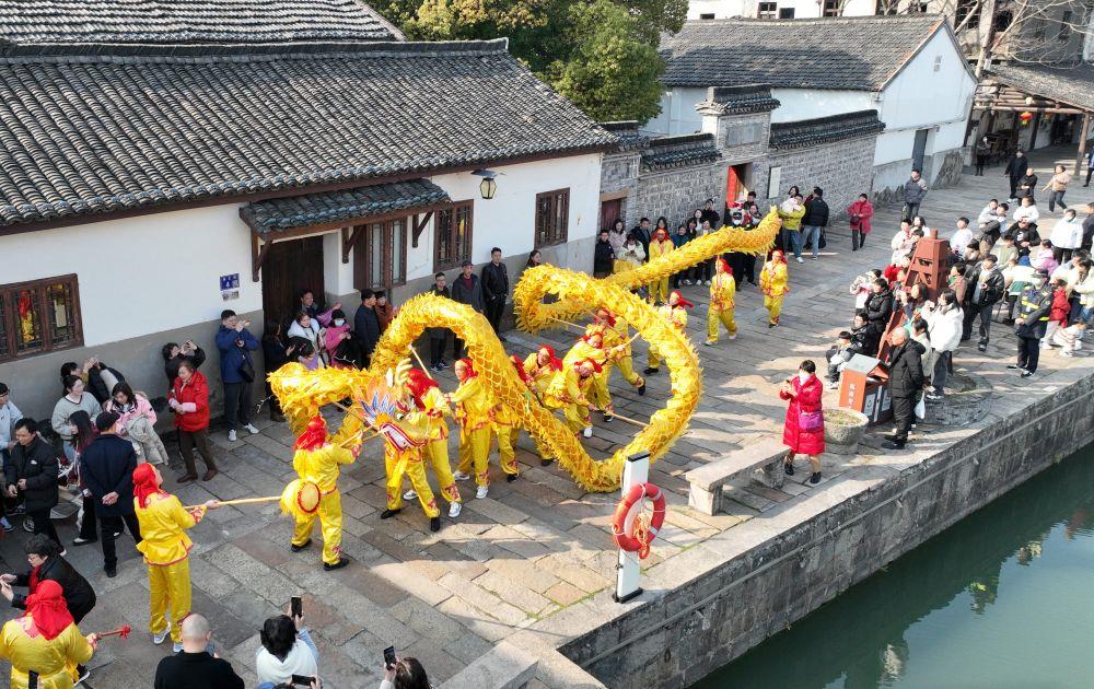 △2月10日,浙江湖州市德清县新市古镇舞龙表演。
