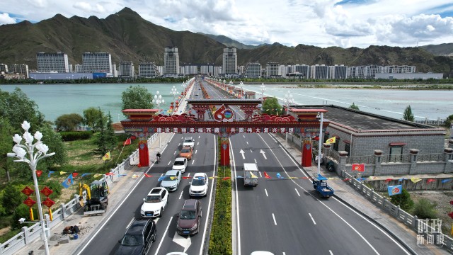 △拉萨街头庆祝西藏自治区成立60周年的巨型横幅。(总台央视记者曹亚星拍摄)