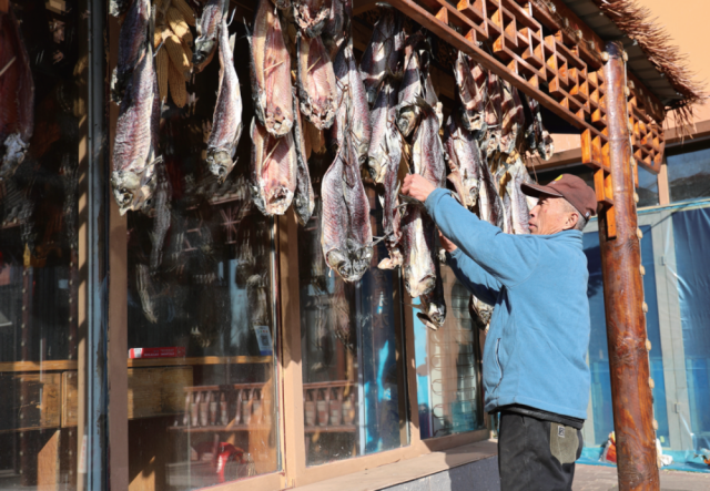 2025年11月22日,查干湖畔一家农家乐的老板在晒鱼干。从整条鲜鱼到分割鱼,从线下到线上,查干湖的“鱼产业”年年攀新高,2023年、2024年销售额均在5000万元以上。