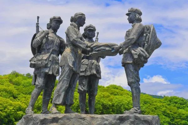 (汝城县文明瑶族乡沙洲村“半条被子”雕塑。湖南日报全媒体记者 徐行 摄)
