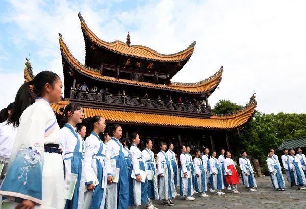 (4月27日,岳阳市岳阳楼小学五年级学生在岳阳楼下诵读千古名篇《岳阳楼记》。湖南日报全媒体记者 田超 通讯员 蒋望来 摄)