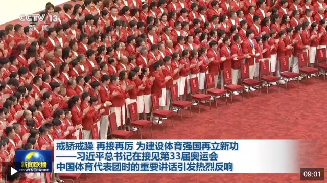 在热烈的掌声中,习近平总书记发表重要讲话。指出中国体育代表团的优异成绩,既是我国体育事业发展进步的集中体现,也是中国式现代化建设成就的一个缩影,充分彰显了新时代中国力量。