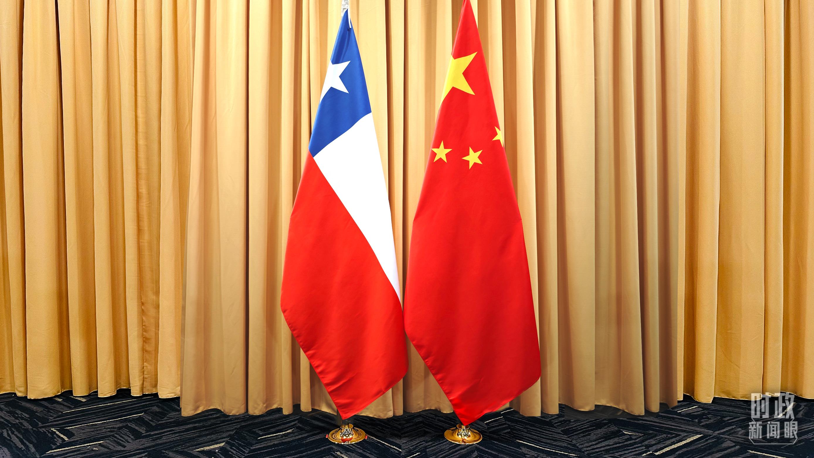 △会见现场的中智两国国旗。(总台央视记者耿小龙拍摄)