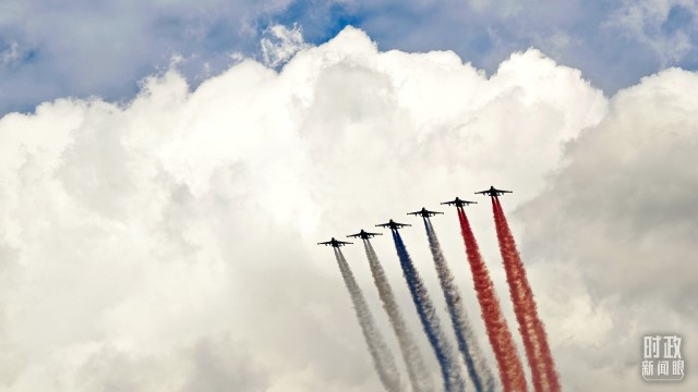 △5月7日,参加纪念苏联伟大卫国战争胜利80周年庆典彩排的空中飞行梯队飞越红场。(总台央视记者王哈男拍摄)