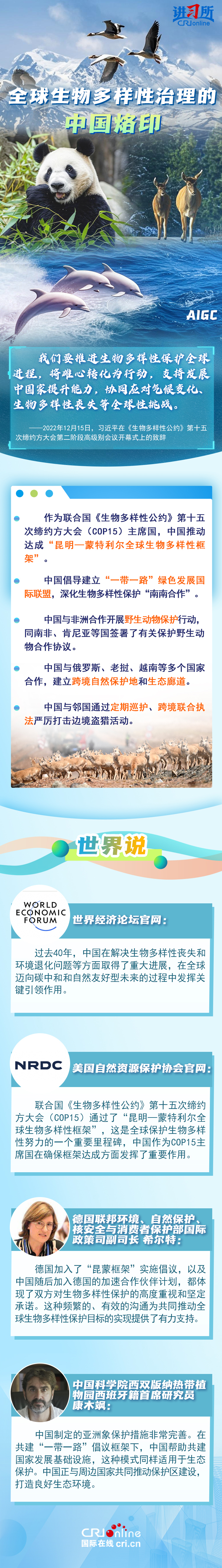 “心往一处想、劲往一处使,共建地球生命共同体。”作为最早签署、批准《生物多样性公约》的缔约方之一,生物多样性保护已经上升为中国的国家发展战略。国际人士表示,中国的一系列举措体现出对生态环境保护的坚定决心,同时,中国依托共建“一带一路”倡议等国际合作机制,为推动全球生物多样性保护提供了有力支持,在迈向自然友好型未来的过程中发挥关键的引领作用。
