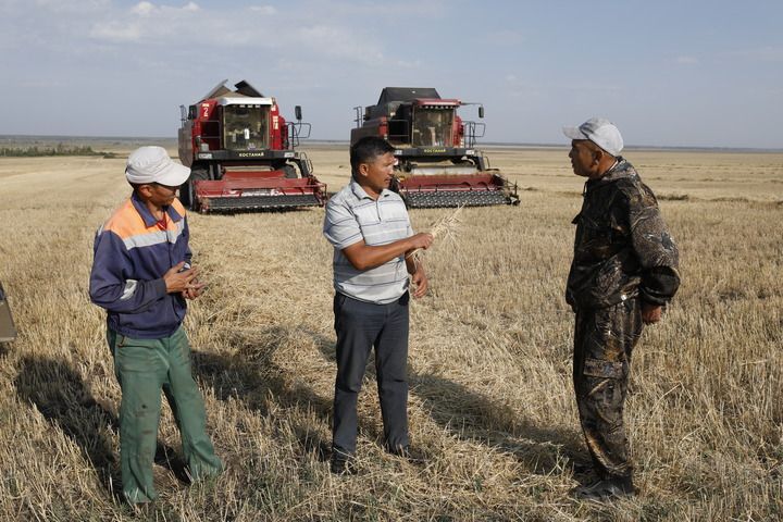 2022年9月2日,在哈萨克斯坦北哈萨克斯坦州,与爱菊集团合作的农场主在收割。新华社发(奥斯帕诺夫摄)