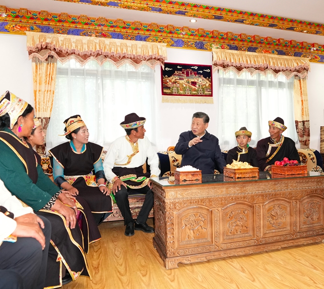 2021年7月21日下午,习近平在林芝市巴宜区林芝镇嘎拉村,同村民达瓦坚参一家人围坐在客厅里聊家常。新华社记者 李学仁 摄