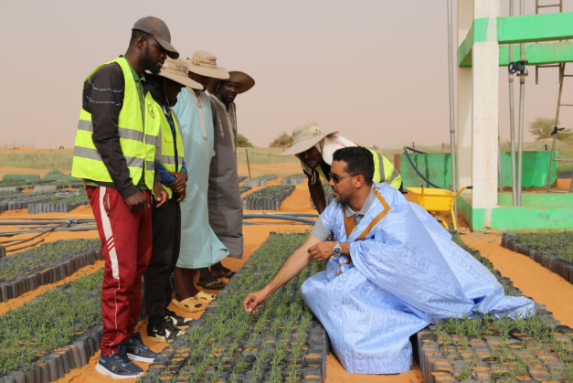 2025年5月22日,在毛里塔尼亚西部特拉扎区比尔·巴尔卡村,中非绿色技术公园毛里塔尼亚示范项目毛方协调员图拉德·迈杜向工人传授固沙植物种植技术。新华社记者 司源 摄