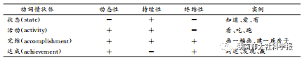 例(1)各句中动词(组)的内在情状区别最早由Vendler(1957)系统揭示出来,他根据“动态性”(dynamic)、“终结性”(telic)和“持续性”(durative)三项语义特征将动词分为状态动词、活动动词、完结动词和达成动词四类,具体如表1所示。
