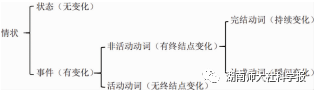 需要注意的是,并不是所有的事件都有这完整的五个阶段。我们可以根据事件内部阶段的有无和多少区分出不同类型的动词(谓语)情状。