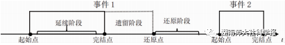 事件的五个阶段包括起始阶段、延续阶段、完结阶段、遗留阶段和还原阶段。其中,起始、完结、还原都是界变点,属于质变,跨越界点后就进入新的状态,即起始点后的延续状态,完结点后的遗留状态和还原点后的还原状态。还原状态一直延续到下一个事件的起始点之前。这三个状态都有续段特征,可以有量的变化。事件的五个阶段用图4表示如下。