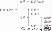 内部视点体是置身于事件变化过程选取观察点,看变化各阶段的时间分布状况。根据所站的位置不同分为三类:站在事件变化之前,站在事件变化之中,站在事件变化之后。在这三类不同位置看到的事物变化的状态便是内部视点体。描述事件发生变化之前的是将然体,描述事件正在变化的是进行体,描述事件变化之后的是已然体。