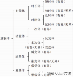 从事件变化的时间量看,大致有三个参数:一是时长和时距,时长是事件变化持续时间的长短,分为长时和短时。时距是事件变化时间距离参照时间的远近,分为远时和近时,时长和时距的量统称时量。二是频率,事件变化发生次数的多少,是一次还是多次,频率的量为动量。三是速率,即事件变化速度的快慢,是瞬变,还是渐变,速率的量为速量。这三方面的量还可以复合使用。量貌体的表达手段,主要是动词的变化形式、时间限制词和一些动词格式等。汉语的量貌体系统见图9。
