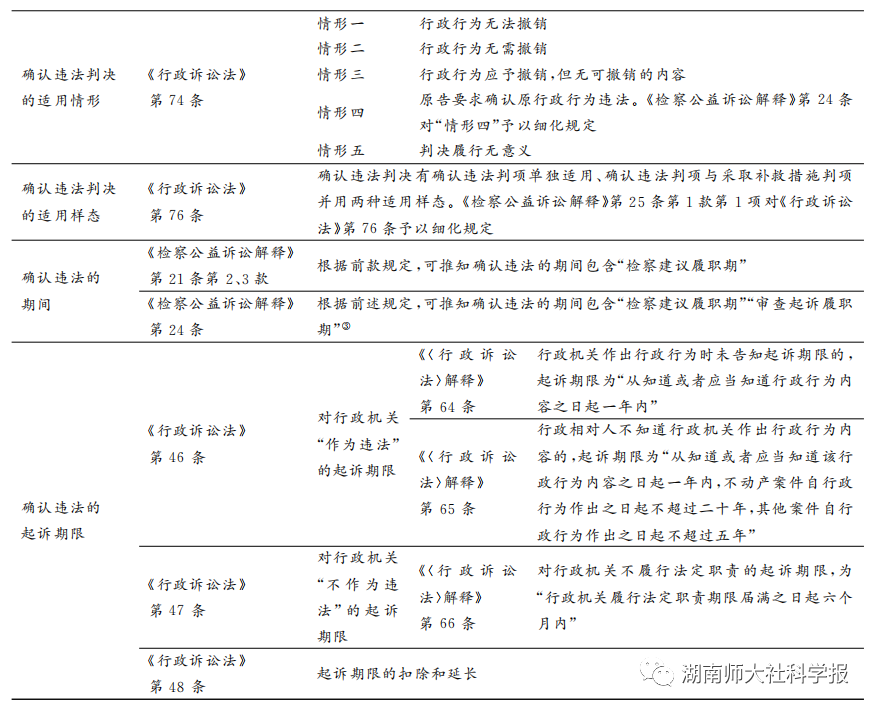 《行政诉讼法》《检察公益诉讼解释》《〈行政诉讼法〉解释》均属于环境行政公益诉讼中确认违法判决的法律渊源,笔者将前述规定中有关确认违法判决的主要条文梳理如下(表1)。我们不难发现:尽管前述规定中有关确认违法判决的五种适用情形与两种适用样态均规定得较为明确,但既未规定确认违法判项与履行职责判项可以并用,也未对“检察建议前履职期”是否纳入确认违法的期间以及如何适用确认违法的起诉期限予以明确。