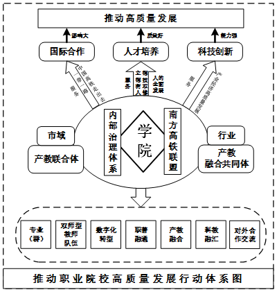 以湖南高速铁路职业技术学院为例,构建如图1所示的职业院校高质量发展行动体系图,依托南方高铁职教联盟,基于学院内部治理体系,校企联合建设集产学研一体的产教融合共同体,主动对接一带一路、乡村振兴战略、高铁及轨道交通产业链集群、湖南省十大支柱产业、衡阳市产业链,以开展国际合作、人才培养、科技创新为手段,主动服务产业需求,优化专业人才供给,培养行业紧缺高技能人才,落实专业(群)建设、“双师型”教师队伍建设、数字化转型等7个方面,产出一批支撑区域产业和经济社会高质量发展的突出成果,推动学院高质量发展。
