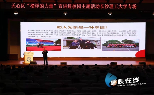 星辰在线12月10日讯(通讯员 彭彦婷)“奋斗的过程本身是艰辛的,但是在奋斗中能体会很多幸福”,12月10日下午,天心区“榜样的力量”宣讲进校园主题活动在长沙理工大学城南学院报告厅内举行,该校五百余名师生参与了活动。