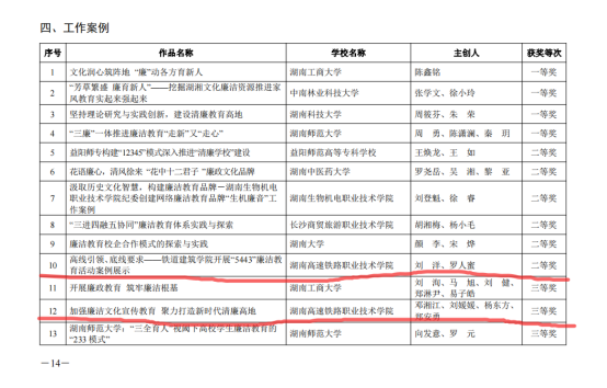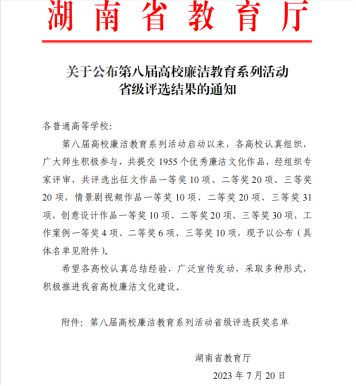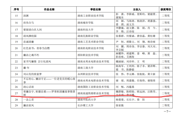 星辰在线7月26日讯(通讯员 王芳)近日,湖南省教育厅公布了“第八届高校廉洁教育系列活动”优秀廉洁文化作品名单,湖南高速铁路职业技术学院征文作品获2个二等奖、情景剧短视频获1个二等奖和1个三等奖、工作案例获1个二等奖和1个三等奖。