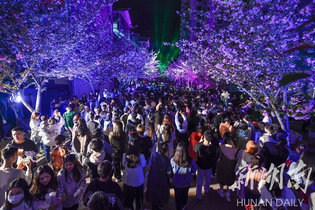 樱花路上,整条街道在精心设置的灯光下变得绚丽多彩,光影相错,让樱花更加娇艳动人。伴随着动感的音乐,师生们一起舞动起来,营造了一种欢乐祥和的节庆氛围。而本次活动了还采用了微信公众号线上直播的方式,许多已经毕业的校友纷纷在弹幕留言,表示了对母校的怀念与祝贺。
