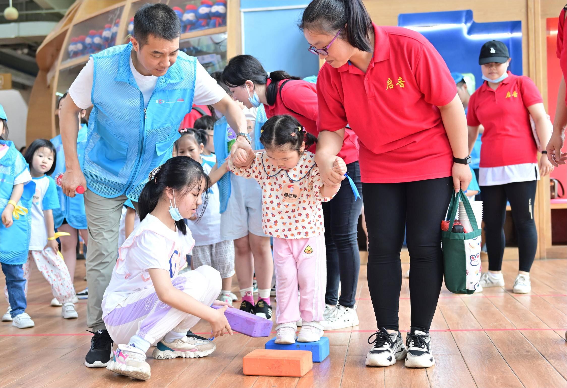 (成人儿童结对开展游乐活动,欢乐多多。)
