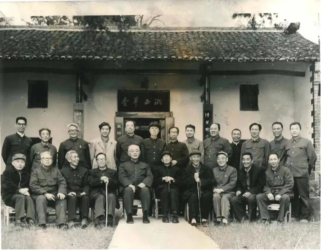▲1982年纪念王船山逝世290周年学术研讨会,与会专家在湘西草堂前合影后排左一:王兴国