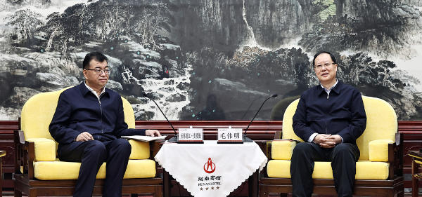 12月6日上午,省委副书记、省长毛伟明在长沙与新疆维吾尔自治区党委常委、自治区政府副主席玉苏甫江·麦麦提率领的新疆代表团一行座谈。