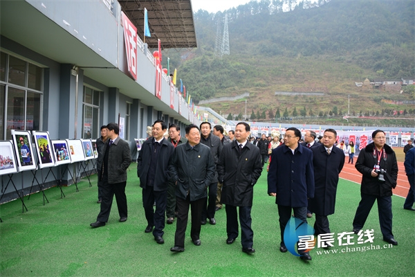 2012年12月18日,中国凤凰国际(民俗)摄影双年展在凤凰古城举行开幕式后,出席活动的领导在县民族体育馆观展(前排左起:罗明、何泽中、王克英、叶红专、武吉海、曾星明)