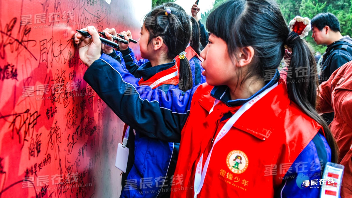 近万名“雷锋少年”参与学雷锋主题活动打卡,图为学生们在签名墙上签名。