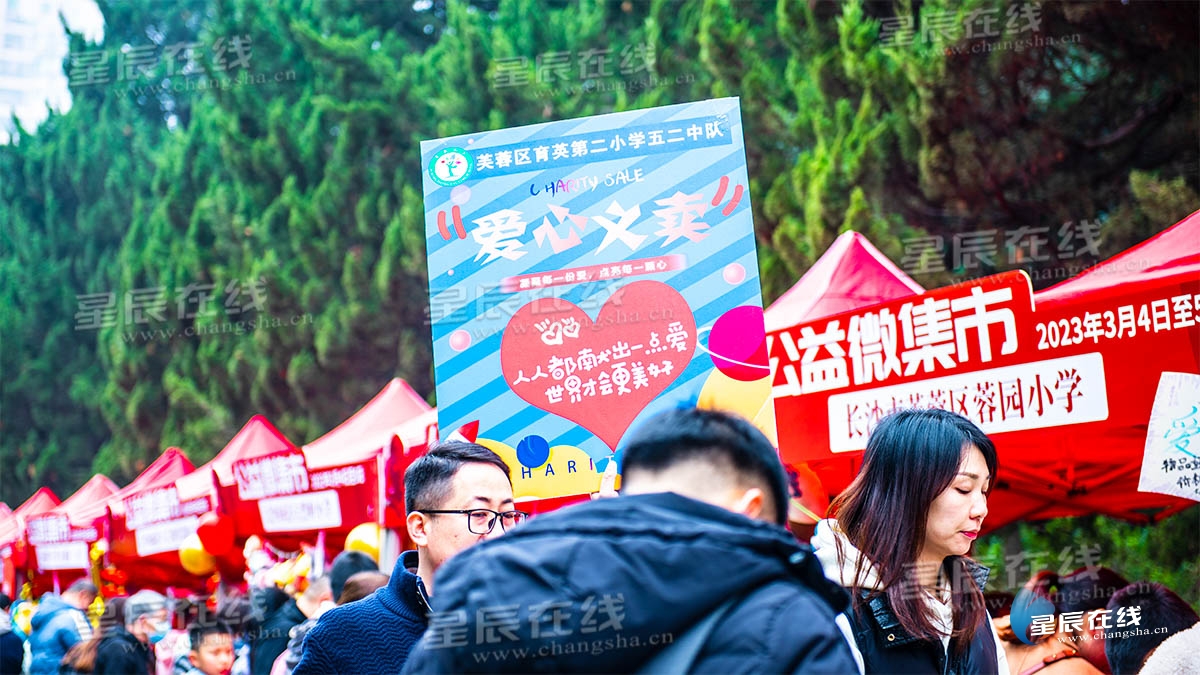 场外的爱心集市亦是热闹非凡。一位志愿者举着爱心义卖的海报。