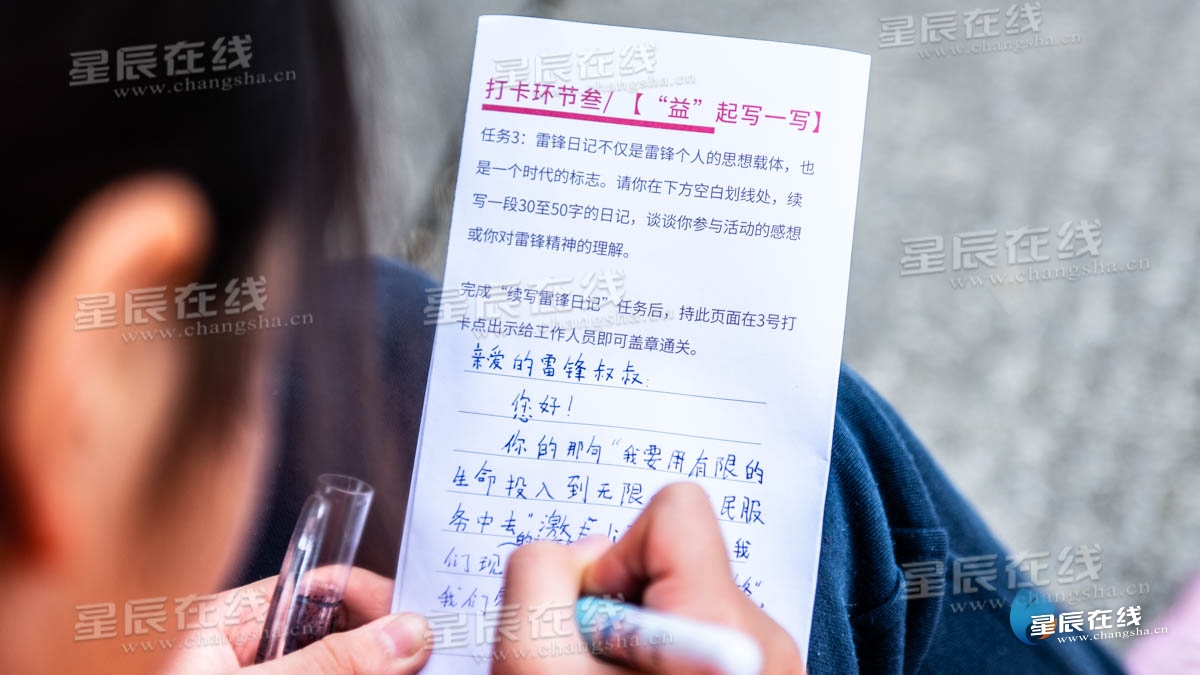 活动还设置了学习闯关环节,“雷锋少年”们要参与雷锋日记学习、答题以及心得分享才能收集积分。图为一位小学生正在写活动心得。