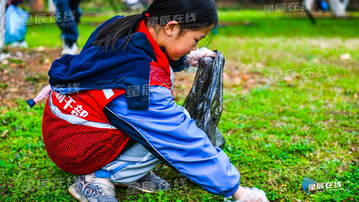 在湖南烈士公园,“雷锋少年”们开展环保志愿服务主题活动,他们捡起草坪里细小的垃圾。