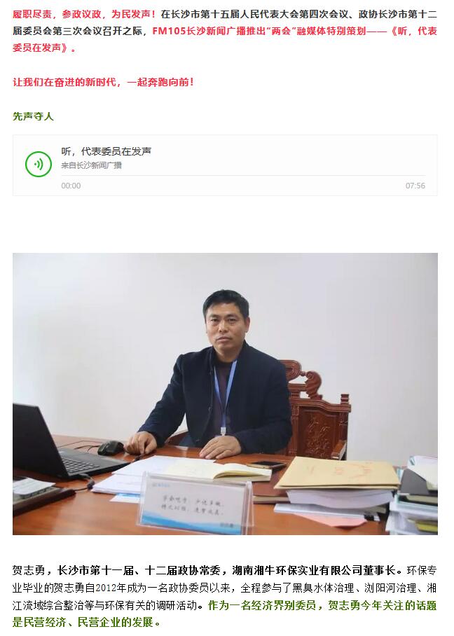 贺志勇,长沙市第十一届、十二届政协常委,湖南湘牛环保实业有限公司董事长。环保专业毕业的贺志勇自2012年成为一名政协委员以来,全程参与了黑臭水体治理、浏阳河治理、湘江流域综合整治等与环保有关的调研活动。作为一名经济界别委员,贺志勇今年关注的话题是民营经济、民营企业的发展。